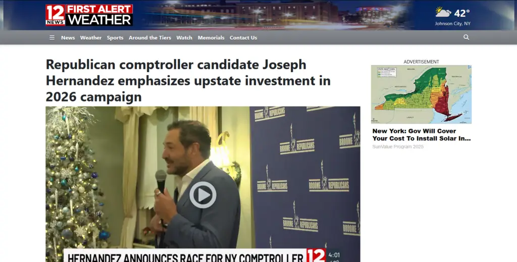 Joseph Hernandez, the Republican candidate for New York State Comptroller, is emphasizing the need for stronger investment in Upstate communities as part of his 2026 campaign. Speaking during a visit to the Southern Tier, Hernandez said Albany has too often overlooked large portions of the state when it comes to economic development, infrastructure spending, and […]